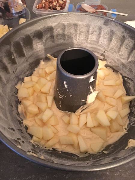 倒入模第一層原色再加蘋果丁,原色再倒入可可色,蘋果丁-以此類推